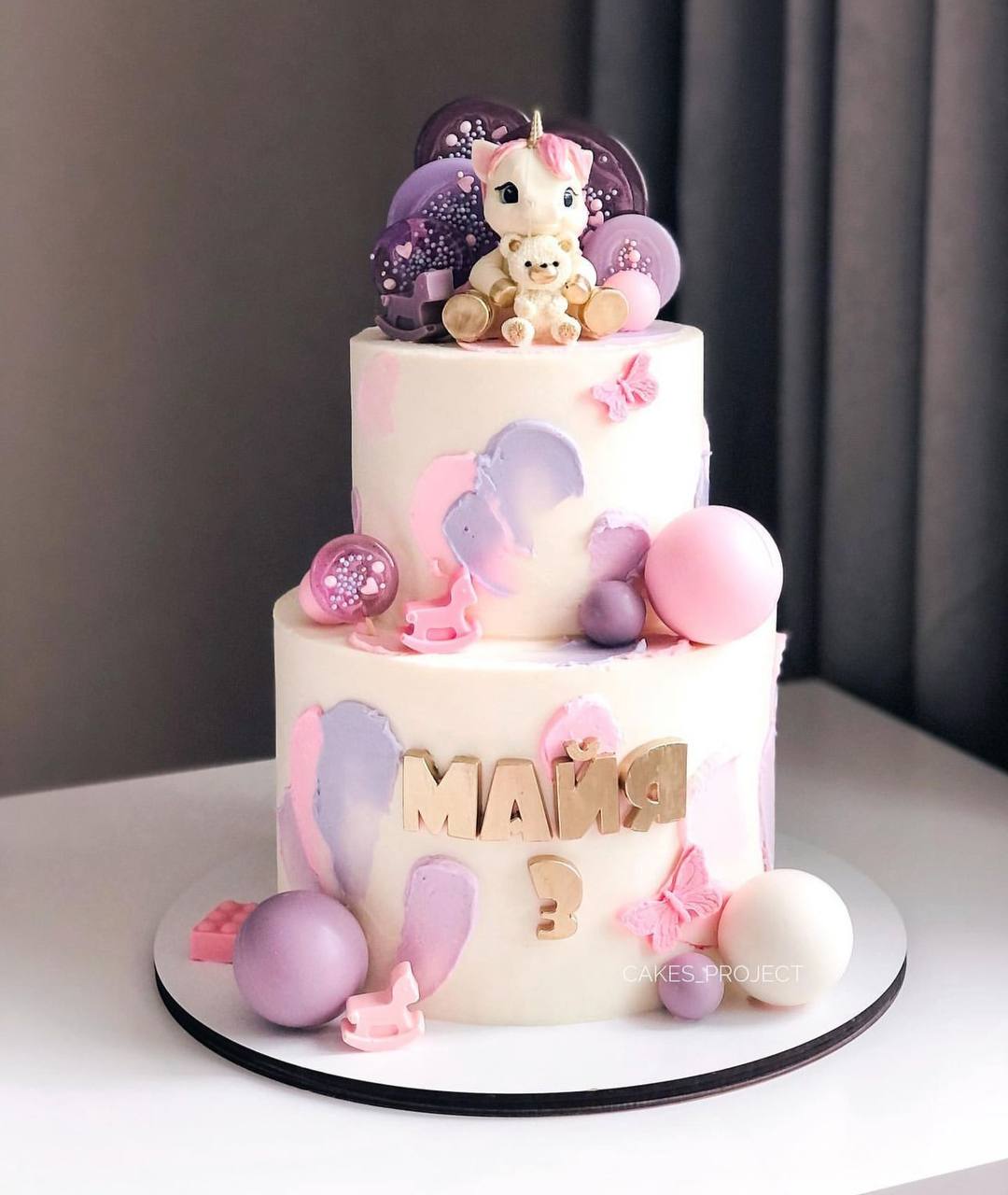 Этот торт станет настоящим украшением любого торжества и создаст атмосферу радости и чуда. Его дизайн выполнен в нежных розовых оттенках, а на поверхности красуется фигурка мифического существа — единорога.